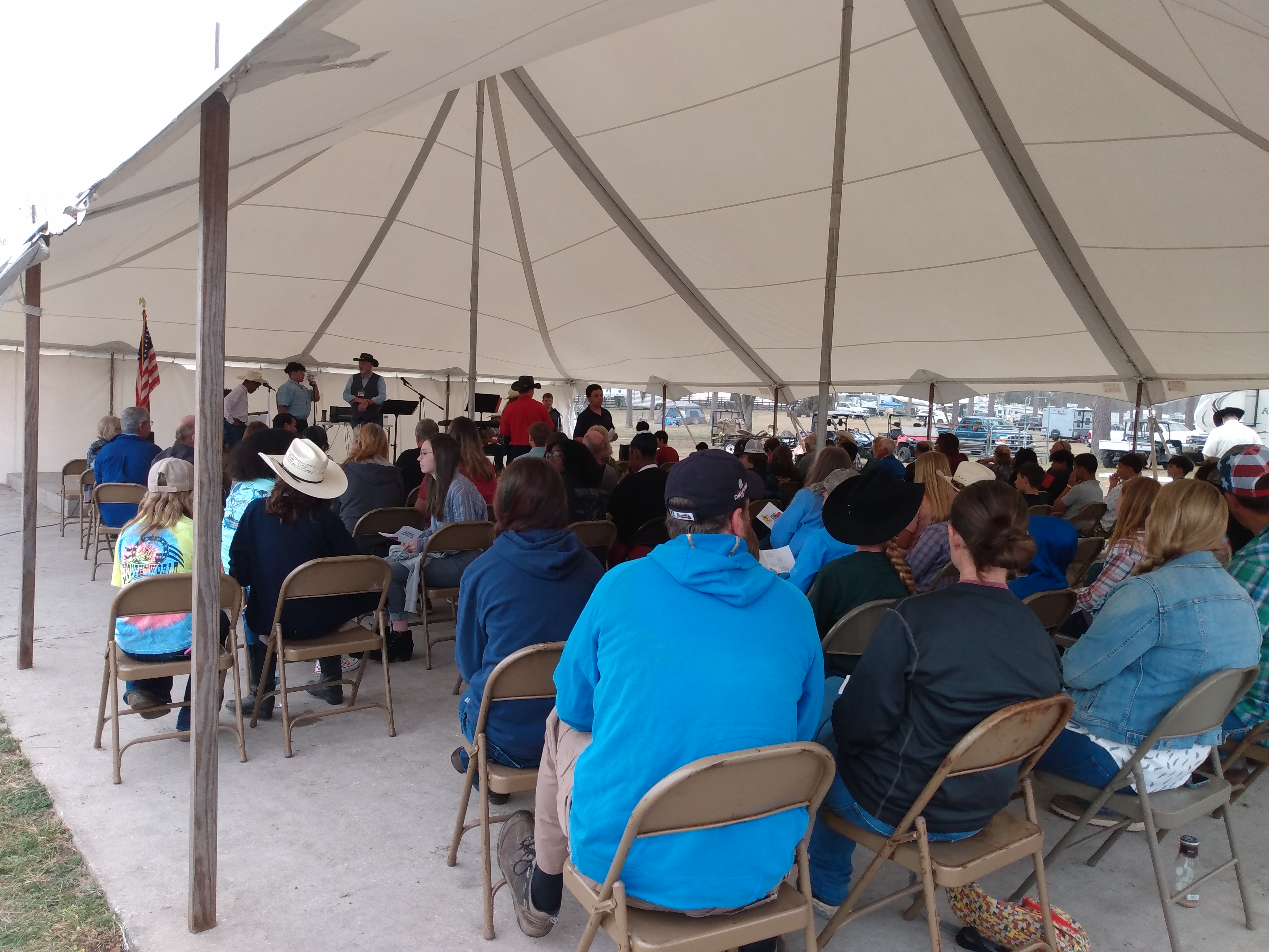 The grounds all around the arena are sectioned off to identify camping spots for those coming for the weekend. Tents are set up. The stage for the dance and Sunday morning church service has to be set up. Power has to be run. Since the grounds around the arena are used for grazing most of the time, the grounds need to have some clean-up done. The pavilions and bathrooms need to be cleaned. Tables and Chairs need to be brought in and moved to different locations as needed. Most of this is done by the Maintenance, Rec Dept, and Farmworkers. This includes youth and staff.