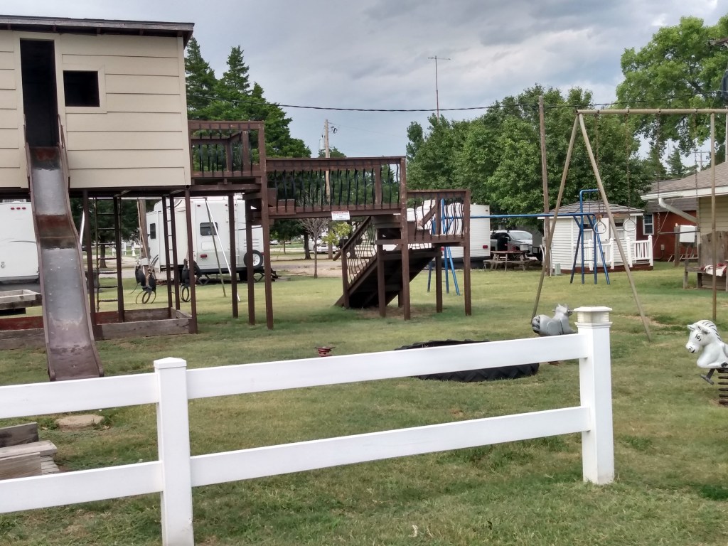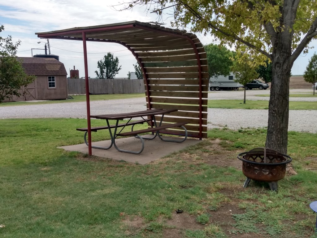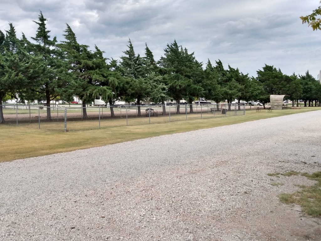 AFter leaving Glen Eyrie yesterday morning, heading east on I-70, we stayed at a privately owned RV park in Russell, Kansas. We found it online and made the reservation about 10 days before our stay. I have to give a shout out to them and I’m posting a link to their website right here https://triplejrvpark.com/ . They’re about 1/2 mile off I-70. Their sites are long and flat. See the pictures I’ve posted below. The roads are wide enough to get in and out of the park. The park is clean and well manicured. There’s a very large dog park if you travel with your furry friends. And, the price was perfect for a quick one night stay.