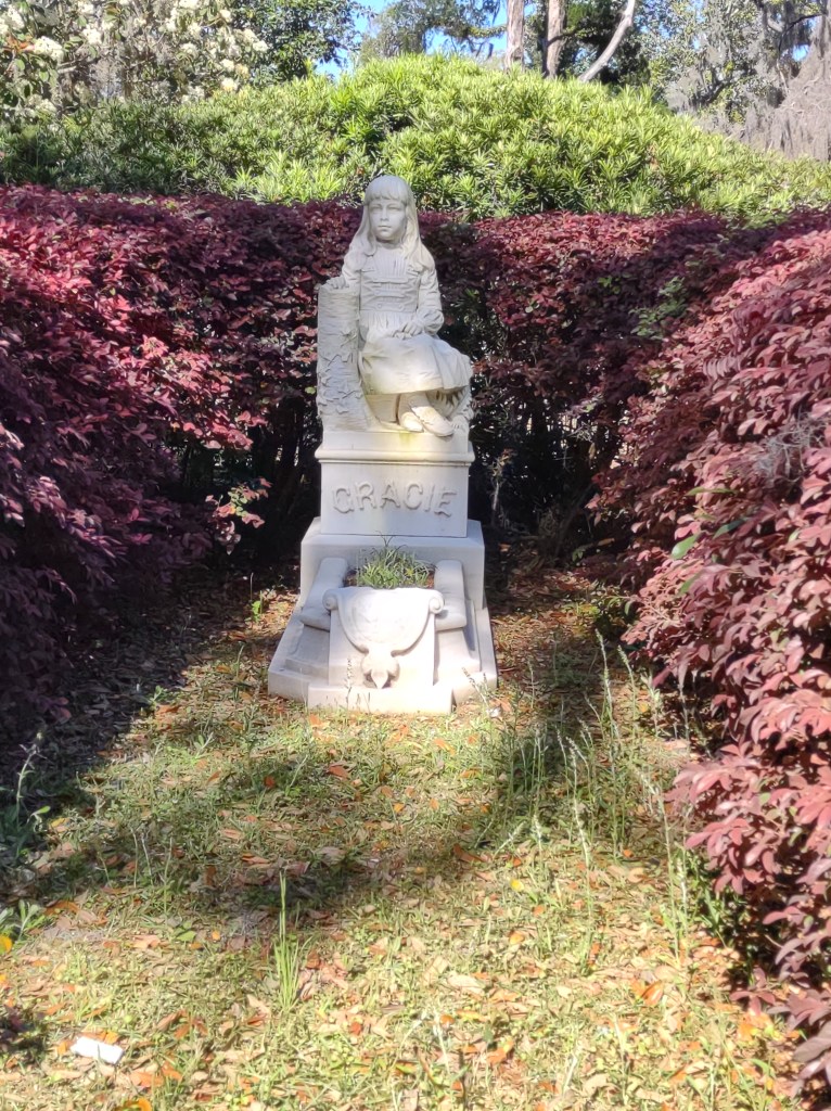Gracie is another often visited grave site in Bonaventure. Gracie’s family owned hotel in Savannah. She was often seen sitting on a stool greeting guests as they arrived. At age 6, she contracted pneumonia and died.